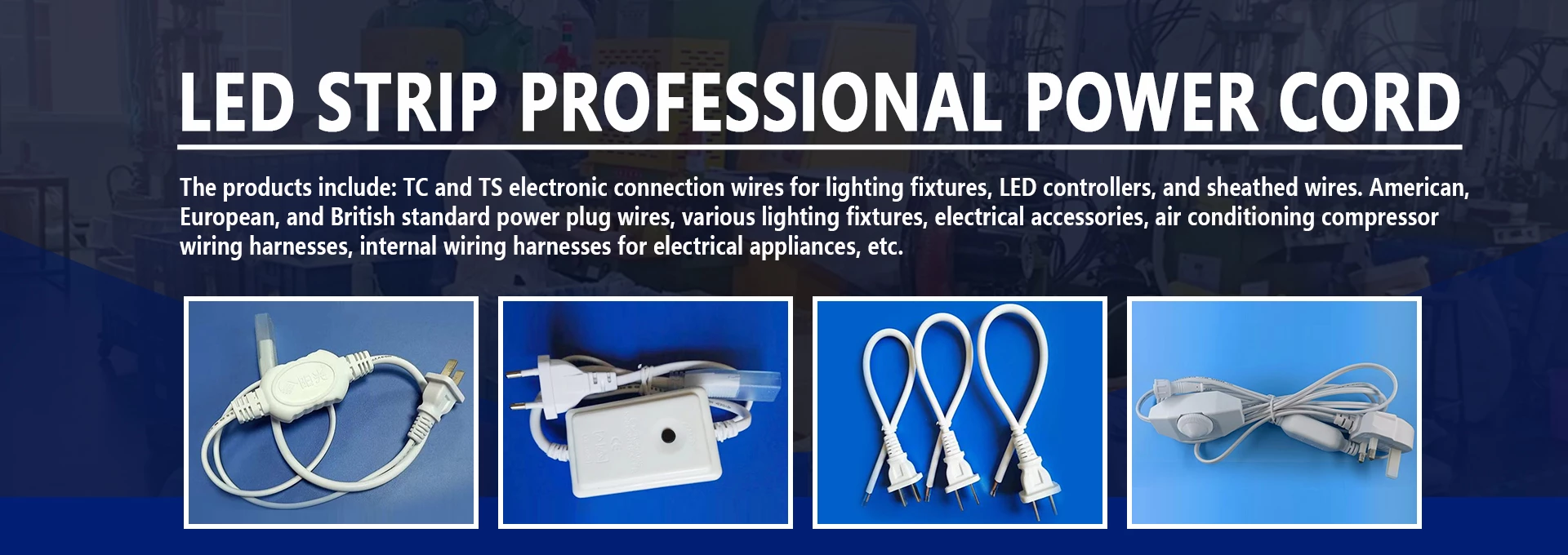 Jiangmen Hanchuan Electric Technology Co., Ltd. is a professional manufacturer of power cords for LED light strips. Our products include TC and TS electronic connection cords for lighting fixtures, LED controllers, and sheathed cords. American, European, and British standard power plug wires, various lighting fixtures, electrical accessories, air conditioning compressor wiring harnesses, internal wiring harnesses for electrical appliances, etc.